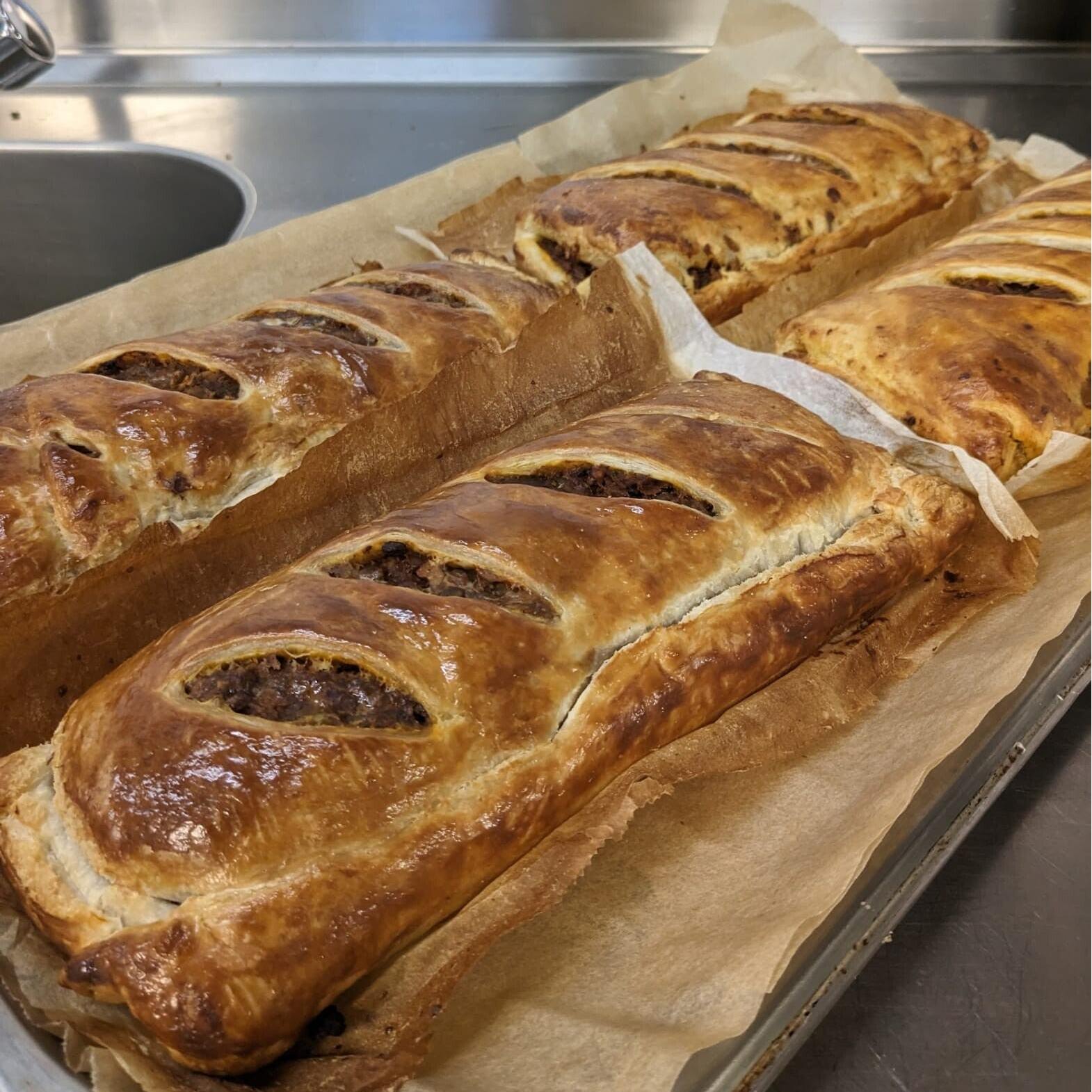 Knapperig bladerdeeg gevuld met walnoten, paddenstoelen en rode linzen.